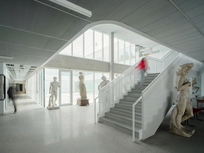 Aprovechando la ubicación del edificio integrada en la trama urbana, se da a la ciudad una pequeña plaza de bienvenida. Creamos un espacio de encuentro que será de los jóvenes, pero también de la ciudad. La pequeña plaza, con el cartel de ARTE permitirá a los alumnos encontrarse a la entrada o salida de clase y sentarse a charlar estando en la calle, apropiándose del espacio público, y activando la arquitectura.