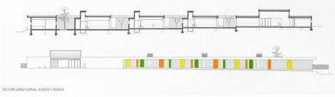 Sección longitudinal, alzado y planta - COAM. "Escuela Infantil en Arganda del Rey". Arquitectura. N.º 348, 2007. -