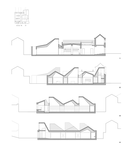 EL ESPACIO ATRAPADO BAJO LA CUBIERTA. El proyecto propone atrapar este espacio bajo una cubierta que solidifique este lugar entre muros, reinterpretando el modo compositivo arraigado en Medina de volúmenes blancos rematados con piezas cerámicas. La cubierta se alza y agacha dibujando una sección quebrada que se reviste completamente con cerámica cocida. Dicha cobertura alberga el nuevo programa, mientras que las antiguas naves del matadero se vacían situándose en ellas los comedores abiertos al patio original.