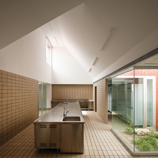 LUZ Y DENSIDAD. Tras la demolición de los elementos de poco interés, se consolida el núcleo original en torno al patio y se disponen bajo la nueva cubierta las cocinas didácticas y las aulas, articuladas mediante gruesas bandas que densifican las transiciones.