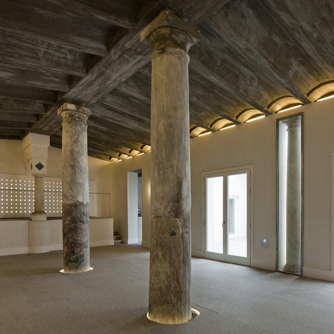 PROYECTOS ENCONTRADOS. La densidad de la arquitectura del antiguo matadero del XIX, constituida por muros, patio, piedras, cal y las columnas desplazadas del templo fenicio de Hércules-Melkart, contrasta con el espacio simétrico que ha permanecido vacío durante dos siglos como lugar de llegada y corral del ganado. Este vacío es el reflejo negativo del propio matadero, un lugar vacante limitado por el potente muro encalado que encierra el solar y rodea a la edificación original.