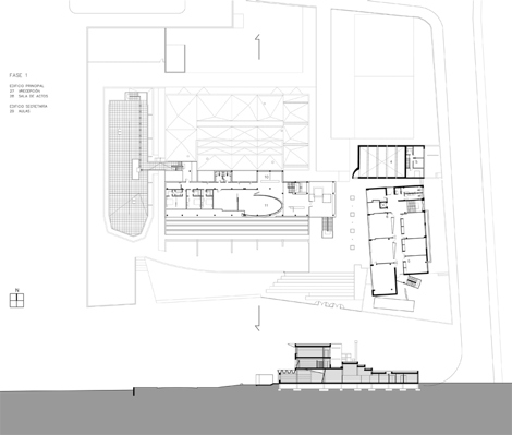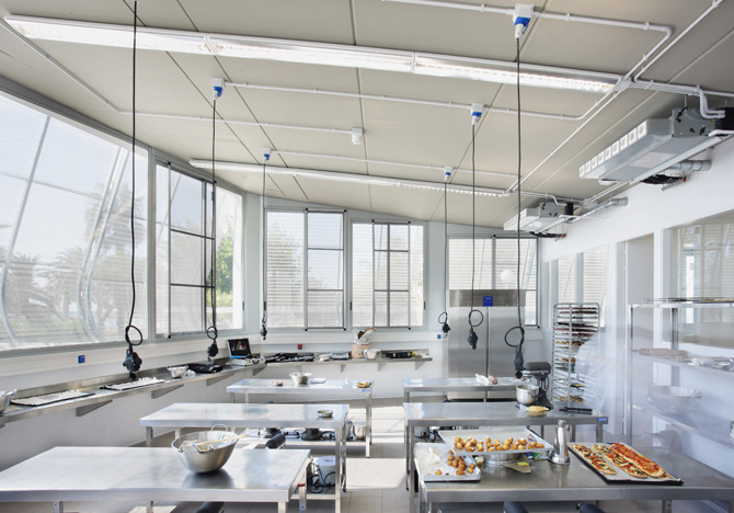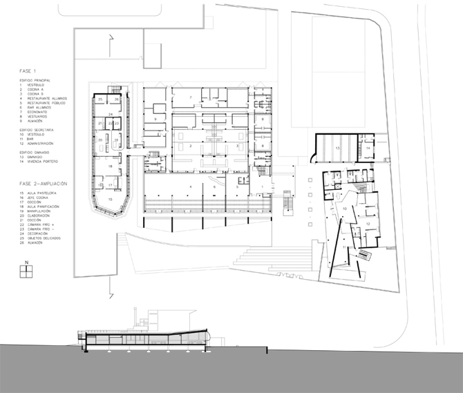 El programa, de gran complejidad, se ha abordado en dos fases de actuación: la primera fase desarrolla el programa del segundo ciclo de formación profesional. Para esta fase se han dispuesto dos cuerpos: en la planta baja, las cocinas y los restaurantes en un volumen cuadrado. El segundo edificio, de dos plantas, se superpone al primero y alberga el programa hotelero y escolar.