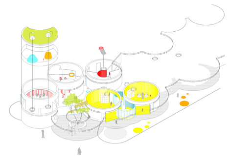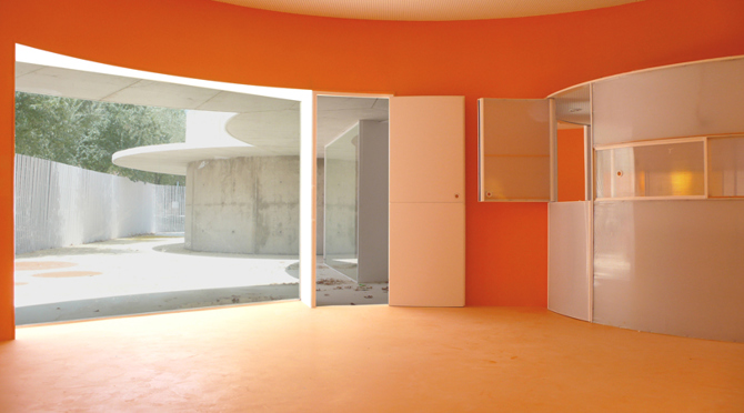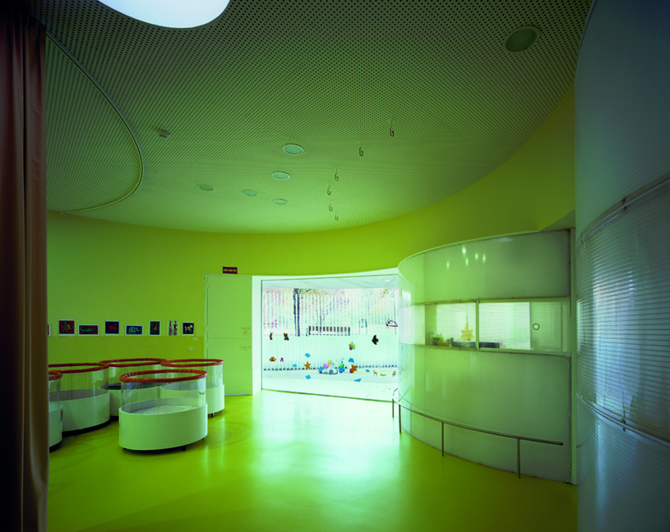 Todo ello se intentó trasladar al proyecto, más aún cuando observamos que los niños siempre tienden a jugar en círculo (el corro, la silla, las tabas...); todos a esas edades se sienten iguales. La ordenación lineal entre las personas suele ser impuesta por una disciplina, lo natural es el “rebaño compacto”. Cuando juegan solos tienden a rodear su entorno cercano con juguetes que puedan tener al alcance de la mano. Esta situación circular junto a la necesidad de controlar lo que ocurre fuera de tu “cueva” condujo a abrir un solo gran hueco al exterior en cada célula. La forma circular permite ser vigilada desde cualquier punto del perímetro.