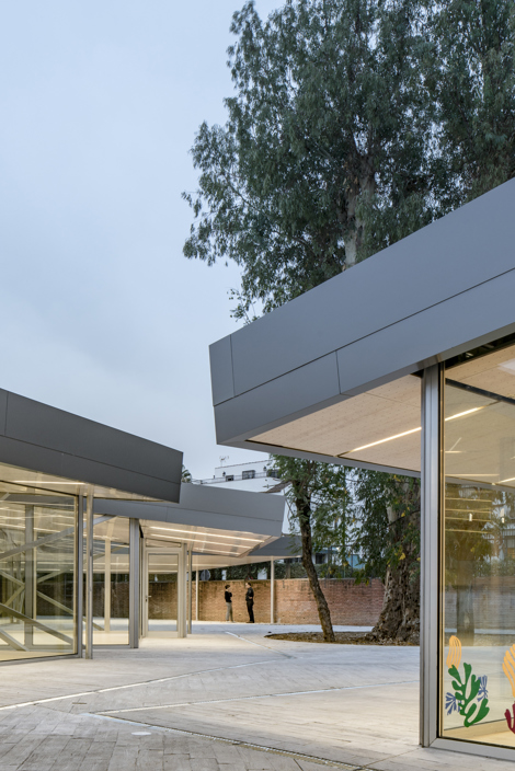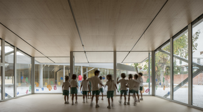 El proyecto crea un ámbito de acceso y de separación respecto del colegio preexistente al plantear un patio alargado a modo de calle desde el que se accede al conjunto. Este organismo de aulas y espacios, una suerte de racimo, conecta con las tres aulas originarias de la escuela infantil.