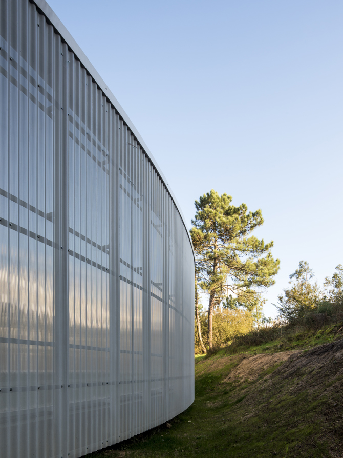 La fachada se conforma con chapas metálicas onduladas y grecadas que se microperforan en el patio y ante los huecos que se abren al paisaje circundante, permitiendo la visión desde el interior, pero garantizando confort, privacidad y seguridad en todo tipo de circunstancias. Un proyecto que trata de entender y ayudar a ordenar el encuentro de realidades que en él confluyen.