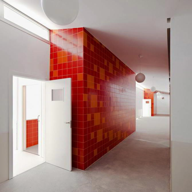 El carácter lúdico de la zona de juegos se ve reforzado por la presencia de murales geométricos de vivos colores diseñados por el artista Eduardo Barco.