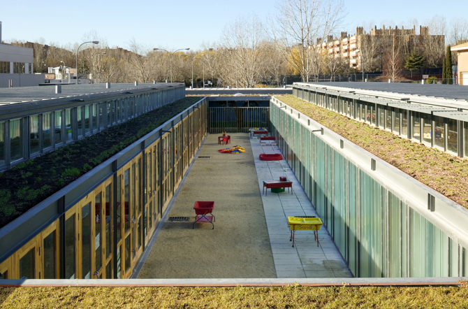 La intención principal se basa en la idea de aula infantil (3, 4 y 5 años) proyectada como espacio abierto y en relación al jardín de actividades. Dos aulas, de invierno y verano, resultado de abrir su frente al exterior. La propuesta da importancia al aula como lugar de aprendizaje y juego próximo a las cualidades positivas de la naturaleza. El espacio docente a nivel del terreno extiende las actividades infantiles y se proyecta como medio para vivir con naturalidad.