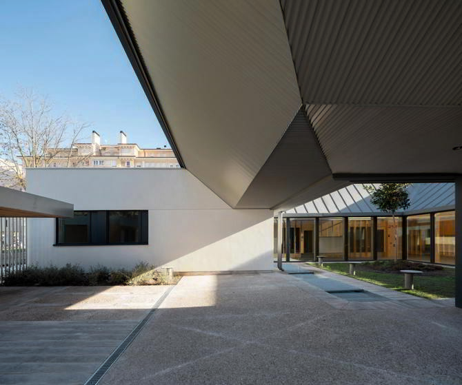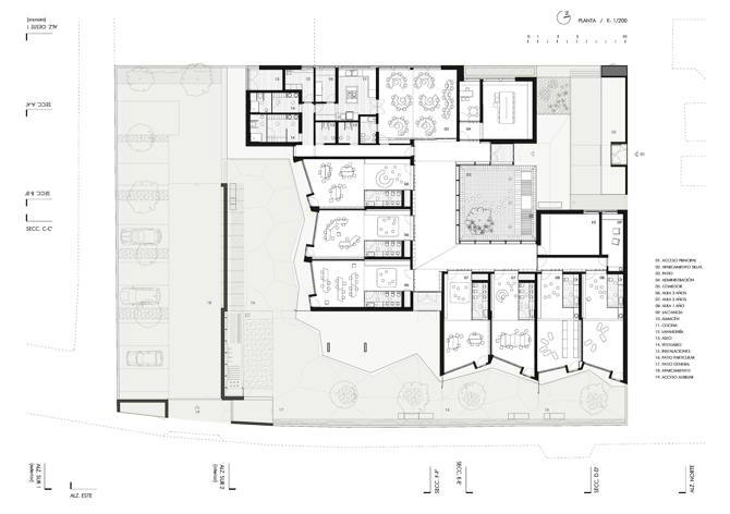 La presente propuesta ha tratado de atender, en primer lugar y de manera equilibrada, a todos estos aspectos. De este modo, advirtiendo las necesidades de control y seguridad, se presenta como un edificio introvertido que hace pivotar toda su actividad alrededor de un atrio central. Este espacio, referencia en todo el conjunto, sirve para articular el ingreso en el conjunto así como para dar escala y cualificar los espacios que sirven a las aulas. La diversificación de espacios exteriores e interiores, ideados como posibles ámbitos de juego diferenciados, trata de dar respuesta por otro lado a la componente recreativa y lúdica. A todo ello hay que sumar la búsqueda de un resultado no estridente, de escala próxima, donde el atrio central, unido a la vegetación existente que se mantiene y la materialidad general elegida, otorgan al centro una dimensión próxima, confortable y ajustada a sus usuarios.