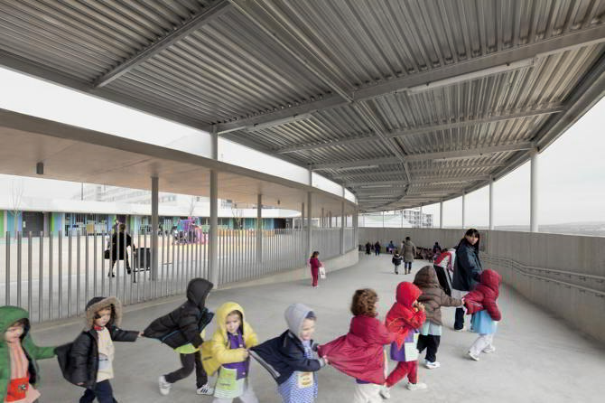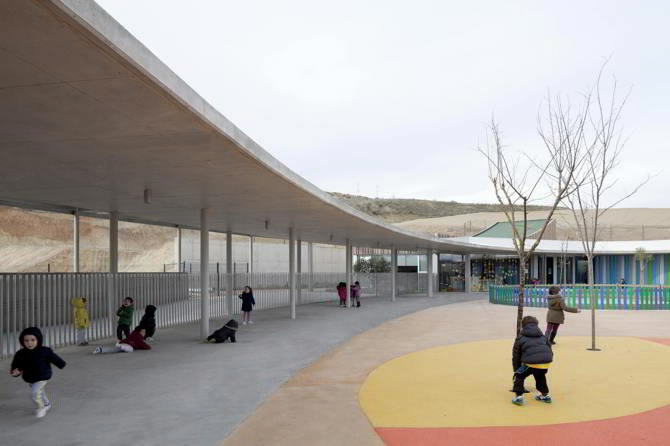 En términos pedagógicos, la idea de construir un lugar de encuentro y relación, capturando una parte del entorno para generar un espacio adaptado a las capacidades de los niños, procede del modelo de piazza central de actividades desarrollado en las escuelas municipales italianas de Reggio Emilia, en torno a la que se articulan los distintos ámbitos infantiles. Sus principios sobre una escuela alrededor de una plaza nos remiten a la idea de un ámbito exterior central, continuo, sin esquinas, fluido, con un trazado curvo y una forma libre, que alude al carácter lúdico del aprendizaje infantil, y ofrece a los niños del barrio una experiencia de la arquitectura más alegre y amable, en evidente contraste con el riguroso orden cartesiano de los bloques lineales de la ordenación residencial.