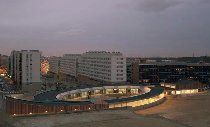 Los condicionantes físicos del emplazamiento, y su particular situación -entre la volumetría rigurosa y seriada de la ordenación residencial y las infraestructuras de transporte de ámbito territorial-, plantean el origen del proyecto desde la capacidad de la arquitectura para transformar un territorio inhóspito en un lugar habitable, incluso para los más pequeños, mediante mecanismos de implantación sencillos y atemporales: construir una plataforma horizontal y configurar y delimitar un recinto.