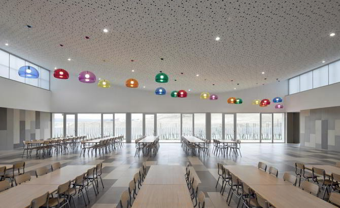 Por otro lado, en los perfiles ondulados y las formas curvas de la cubierta, los niños pueden también encontrar referencias a las formas deslizantes lúdicas de los parques infantiles. La conexión con este universo infantil caracteriza también la presencia material del edificio. Desde el exterior, la fachada curva se configura mediante la disposición de tubos de aluminio coloreados, en una disposición continua y aparentemente aleatoria -inspirada en un conjunto de lápices de colores- que encinta el perímetro exterior del centro. En contraste con el despliegue cromático exterior vinculado al carácter del edificio, el interior ofrece una atmósfera más neutra, con un reducido número de materiales y una abundante iluminación natural.