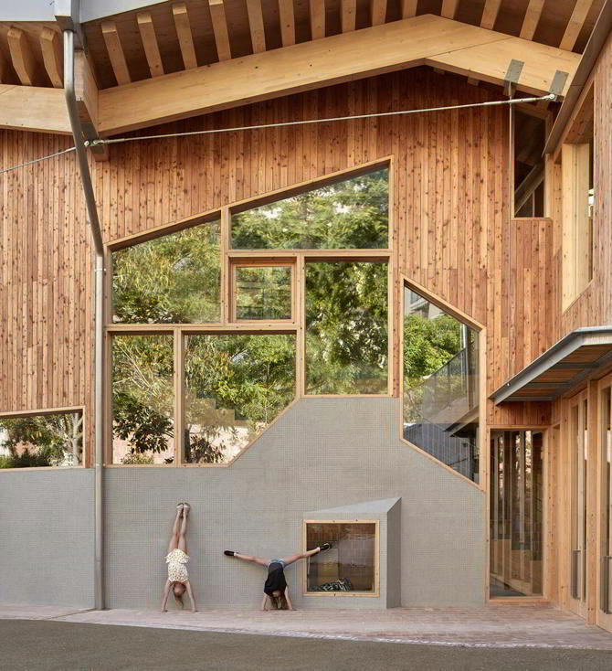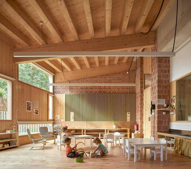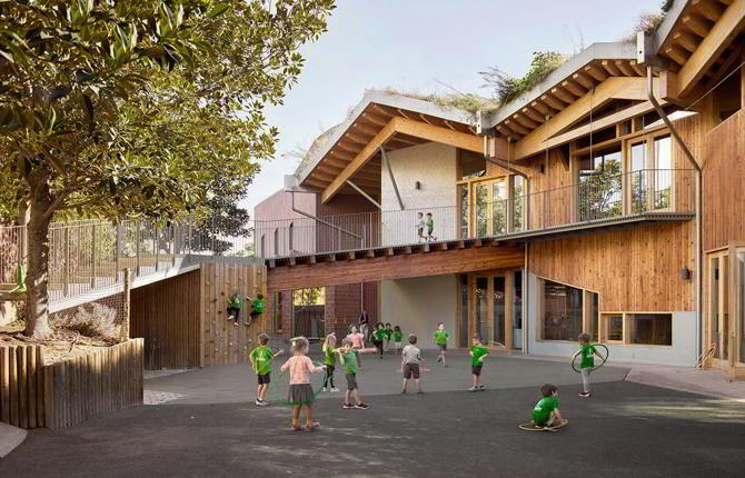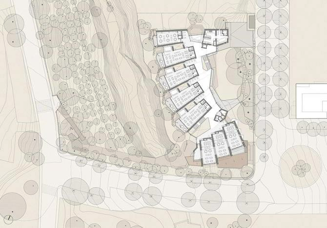 Los niños acceden al colegio cruzando un bosque de pinos, por pasarelas de madera elevadas del suelo, viendo el colegio a través de las copas de los árboles. Los padres podrán aprovechar los remansos de este recorrido como lugar de encuentro y descanso cuando lleven o recojan a sus hijos. Los niños no desaparecen detrás de una cancela, hay una transición y un recorrido de preparación para llegar al colegio... y la ciudad queda atrás
