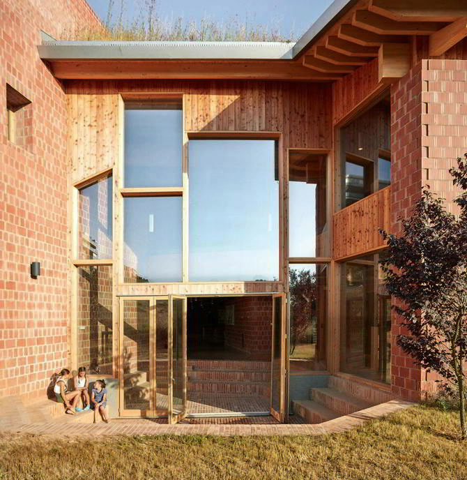 Cada aula se complementa exteriormente con una terraza cubierta, un pequeño anfiteatro, una fuente y un árbol de hoja caduca. Cuando el tiempo lo permite, el aula se abre al exterior y el árbol con sus cambios estacionales se convierte en un compañero más.