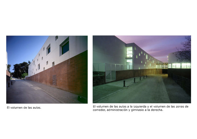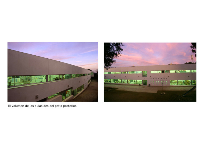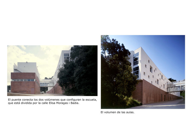 Se decidió formalizar dos volúmenes a cada lado de la calle d’Elisa Moragas i Badia siguiendo la ligera curvatura de la calle y uniéndolos superiormente por un puente. El terreno tiene pendiente, la parte más alta se encuentra orientada a norte y la parte más baja al sur. La edificación asentada en la parte más alta está destinada a aulas. Tiene una planta similar a un tren con el corredor lateral y la sucesión de aulas. La edificación se desarrolla en planta baja y un piso, lo que permite que el corredor interior tenga doble altura y la planta superior actúe como un balcón abierto sobre la inferior. Este corredor se entiende como una calle que relaciona las aulas como un gran espacio público.