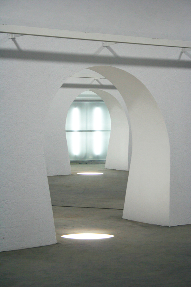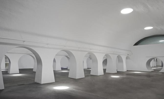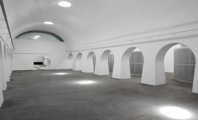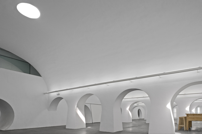 El Espacio de Creación Joven adapta el espacio original, concebido para contener agua, creando huecos: se horadan las bóvedas para lograr una buena iluminación natural del espacio interior y se perfora el muro de separación de los aljibes en cuatro puntos, para crear las conexiones y las comunicaciones necesarias entre los espacios y permitir una correcta circulación, creando cuatro pasos circulares entre ellos. De este modo conseguimos un gran espacio diáfano, limpio, encalado, luminoso, permitiendo la división del mismo en distintas aulas, cuando sea necesario, mediante cortinajes.