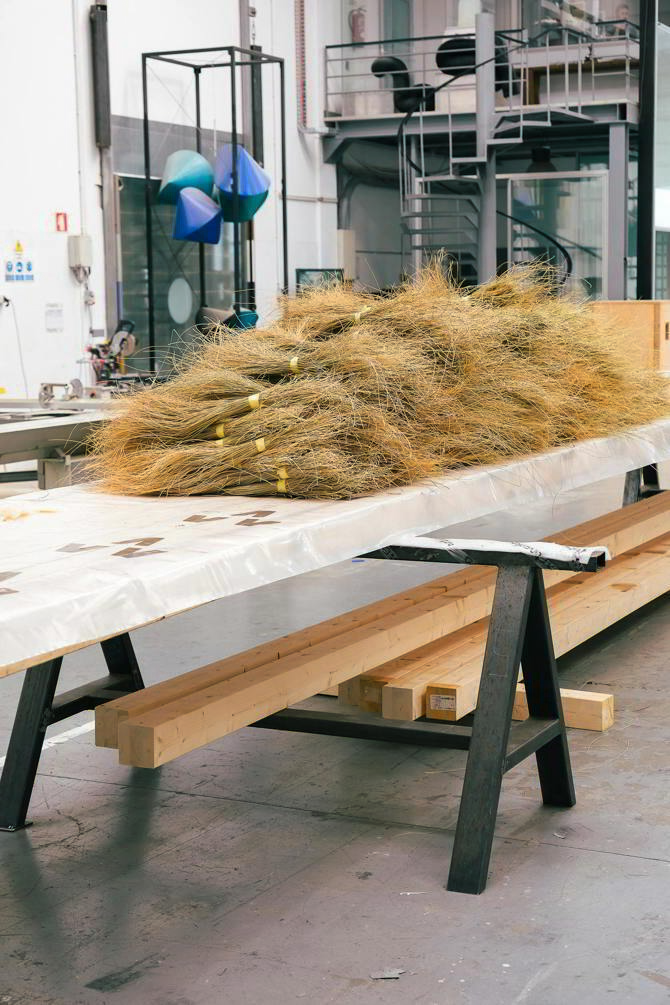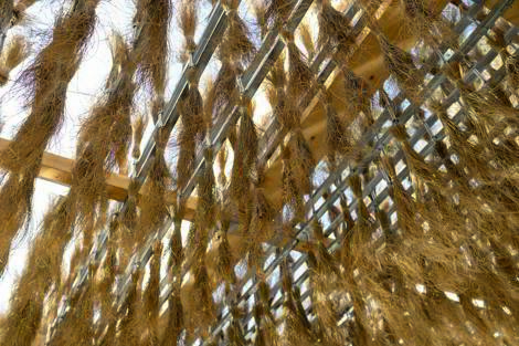 El esparto, por su capacidad natural de formar densas matas, reduce la evaporación del agua y protege el suelo de la erosión. Los espartales generan sombra a nivel del suelo, favoreciendo la retención de humedad y sirviendo como refugio para plantas y animales pequeños en entornos semiáridos. Así, el esparto no solo actúa como una simple cobertura, sino que configura un microclima, potenciado por sus propiedades de movilidad y sonido, las cuales se reflejan en el pabellón. Tradicionalmente, el esparto se utilizaba para la construcción de cubiertas y sombreado en chozas y corrales, debido a la resistencia de sus fibras al sol y su durabilidad. Sin embargo, con la llegada de la producción industrial de plásticos, este fue desplazado, transformando sus usos tradicionales en objetos desechables y desvinculados del territorio. El pabellón, mediante su uso, busca revertir esta obsolescencia, promoviendo un ciclo ecológico más amplio en el uso de los materiales y valorando la cultura material local, desde una perspectiva ambiental, funcional y simbólica. El pabellón se sitúa axialmente frente a Casa Mediterráneo, y la plaza, con sus juegos de agua, se complementa con Atocha, creando una estrategia climática integral. El espesor del cielo de esparto no solo filtra la radiación solar directa, sino que actúa como masa vegetal aislante, ralentizando la transferencia de calor hacia abajo, lo que genera un ambiente térmicamente más estable bajo el pabellón. Aunque el esparto esté seco, su masa vegetal aún influye en el microclima, absorbiendo la humedad del aire durante la noche y liberándola lentamente durante el día. Este efecto se complementa con las piletas de agua, aumentando la humedad relativa y mejorando la sensación térmica.