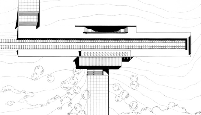 Nos encontramos, evidentemente, ante el conocido tema del muro con un cuerpo adosado al mismo que, en este caso, permite solventar el problema del desplazamiento de los ejes de la avenida de acceso: el arco está centrado con la misma y del paso subterráneo bajo los andenes, mediante el recurso de alargar el muro hasta ofrecer una fachada centrada con los dos tramos de descenso al citado túnel.