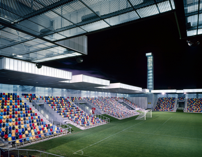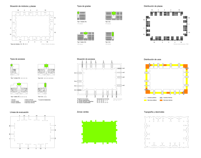 Esto ocurre en un solar de forma casi rectangular previsto por un planeamiento autista sin ninguna ilusión urbana, necesaria en una ciudad desindustrializada y en horas de autoestima baja. La respuesta es un sistema de comportamientos visuales-emocionales reflejados en la forma del edificio que los alberga. Por un lado, la recuperación de un espacio verde continuo donde jugar y sentarse rodeados de hierba que desdibuja los límites disciplinados entre el jugador y el espectador. Por otro lado, la multiplicidad de maneras de mirar en altura y distancia así como las distribuciones de grupos de espectadores y su control configuran diferentes graderíos con pliegues diversos, más inclinados, estrechos o con inserciones particularizadas del terreno de juego para cada uno.