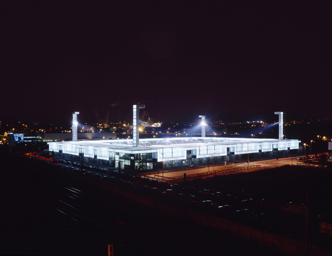 La unidad aparente de toda esta batería de programas la proporciona la cubierta, reflejo directo de la organización interna, permeable a la suave luz del lugar y recortada en las zonas donde la lluvia penetra a los jardines del graderío. La cubrición continúa al exterior, protegiendo las salidas del estadio a nivel de las gradas en los accesos y más cercana al suelo en las zonas de paseo de calle, generando una arritmia que traduce el funcionamiento general en la imagen exterior del edificio.