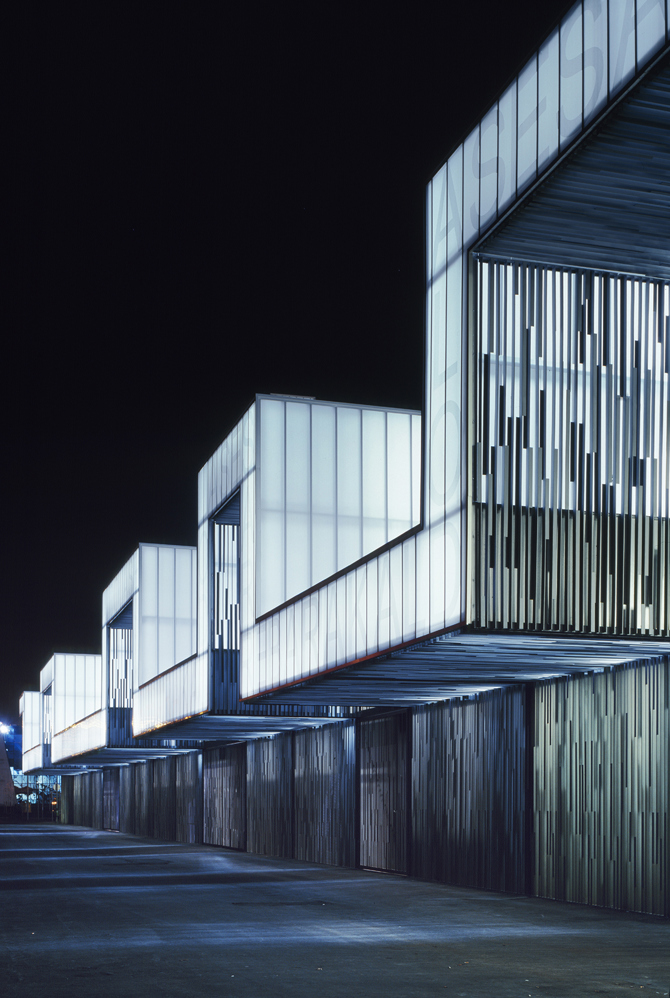 Los accesos a través de este muro vegetal ficticio nos transportan a la geografía alternativa que controla los flujos y estancias de los espectadores. Se configura así un volumen con diversas condiciones lumínicas que actúa de suave baliza en la noche, a modo de las arrugadas lámparas japonesas, capaz de grafiar en la oscuridad el esqueleto del edificio como nuevo emblema ilusionante.