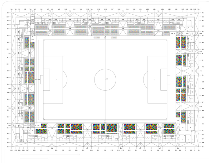 Las cuatro esquinas completan la distribución y de acuerdo a sus diferentes programas, vestuarios, club social e instalaciones se convierten en nuevos edificios autónomos y particularizados en su geometría. Sin olvidar que los jugadores han de esforzarse para que el espectáculo siga, un espejismo cromático fruto de la combinación algorítmica de siete colores llena las gradas de espectadores silenciosos.