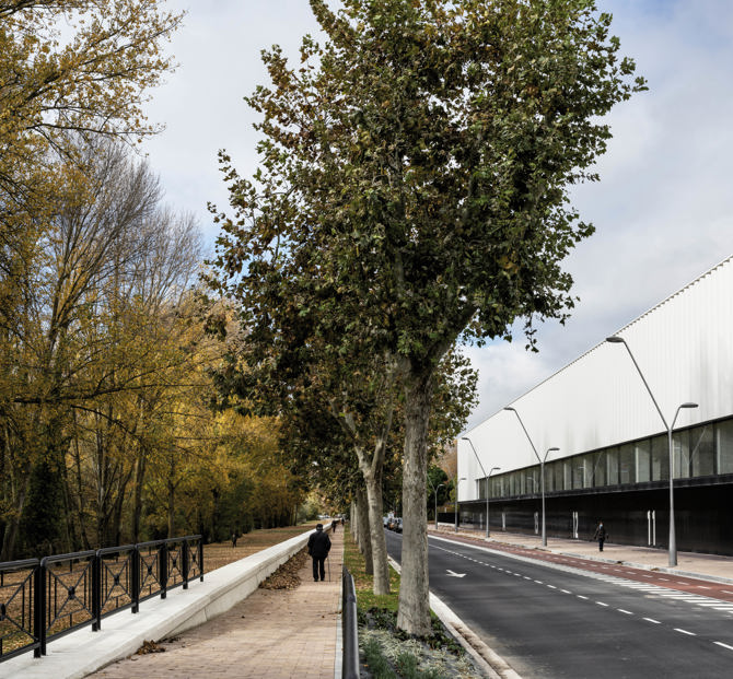 El estadio se ubica junto al río Arlanzón y al parque de La Quinta, situados al sur, y se integra dentro del área deportiva denominada “El Plantío”, formada por diversas instalaciones municipales que discurre en paralelo a este extraordinario entorno natural integrado en la ciudad. Un lugar excepcional y de baja densidad; un contexto que permite entender la necesidad de abrir el estadio y de intensificar sus relaciones, ampliando los espacios públicos perimetrales para mejorar las conexiones y la accesibilidad.