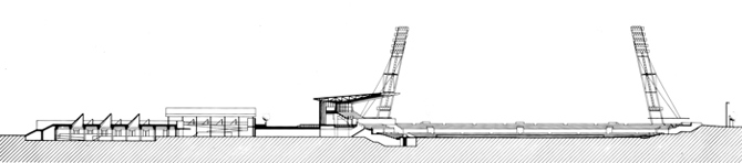 Por otro lado, la tribuna principal se airea y se distinguen las estructuras de hierro de las de hormigón, retrasando el pilar de tensión de la sección principal, obteniendo una larga y curvada ”estoa” de finos pilares como nueva y emblemática fachada. Cuatro altas torres metálicas de iluminación, contrapesadas por ligeras marquesinas en equilibrio inestable, enfatizan las esquinas.