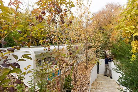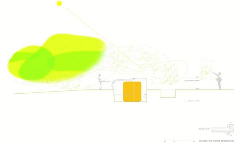 Lo que posibilita el estudio es simple: trabajar bajo los árboles. Para ello se necesitó una cubierta lo más transparente posible, pero también un aislamiento del sol directo: el norte se cubre con una plancha curvada de 20 mm de plexiglás incoloro; y el sur, donde están las mesas, cerrándose lo justo, se cubre con una doble plancha de fibra de vidrio y poliéster de color natural, que aloja en el medio un aislante translúcido. Los tres forman un sándwich de 110 mm de espesor. En el primer caso se logra la visión transparente y limpia del exterior; en el segundo, la translucidez, que solo ensucia la estructura metálica en voladizo del interior de la cubierta, sobre la que se proyectan ligeramente las sombras de los árboles.