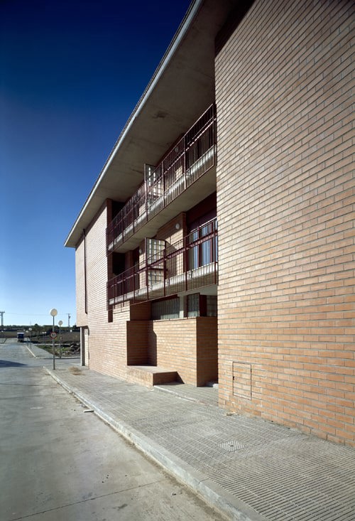 El solar, adyacente a la carretera nacional N-II, fue anteriormente un camping lleno de árboles que nosotros intentamos preservar. El edificio tiene fachada a la calle y a la zona arbolada. Las viviendas cruzan de una a otra fachada y su distribución responde al paso de un espacio a otro. Entre estos dos extremos, las habitaciones y las escaleras se abren al patio.