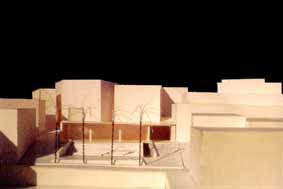 Nuestra intención es recuperar la idea del vacío urbano y crear para el barrio un auténtico punto de encuentro, un espacio para la relación. Organizamos la plaza en dos niveles; una plataforma alabeada al norte se pone en relación más directa con las viviendas; al sur, una zona deprimida donde se pueden realizar actividades culturales (música, teatro, ...). El desnivel entre ambas áreas se salva mediante un graderío que se acomoda a la plataforma superior.