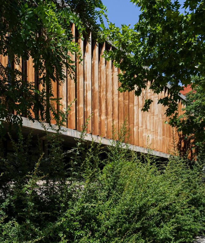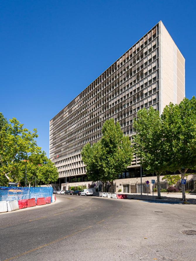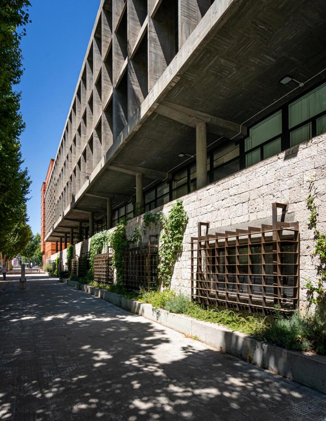 La radicalidad y monumentalidad de la solución se aminora mediante el uso de la escala humana en el cuerpo inferior y el retranqueo del bloque de laboratorios, que así reduce su impacto visual, aunque domina la composición. La variación y el contraste de materiales y líneas de sombra evitan la monotonía de la malla ortogonal que rige el trazado de los alzados.
