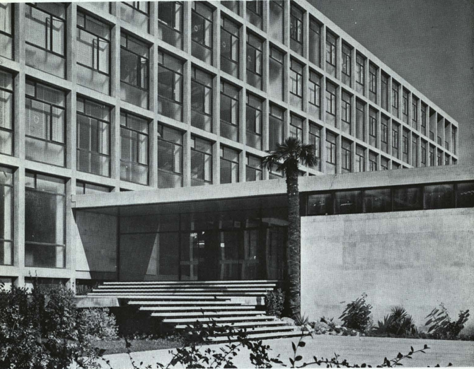 El edificio responde a una estética propia del estilo internacional, un tanto brutalista en la manera de expresar la estructura y los materiales. El proyecto se desarrolla claramente en dos partes: un bloque longitudinal de cinco plantas, que permite aprovechar la mejor orientación posible, y un zócalo de una y dos plantas que contiene los locales que necesitan una estructura distinta, como las grandes aulas y el salón de actos. Esta disposición también permite simplificar los desplazamientos verticales mecánicos.
