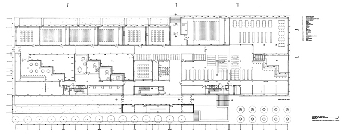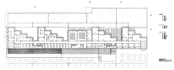 Alineados en la fachada sur se encuentran los seminarios y los despachos de profesores. La entrada principal, en el centro de esta fachada y en un pequeño volumen adosado. En la cara norte, los laboratorios y las aulas de prácticas –ampliaciones del bloque lineal de la cara sur– organizados en cuatro volúmenes que se escalonan en planta.