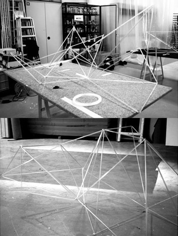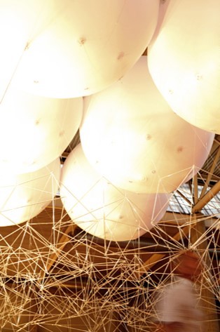 La malla queda totalmente suspendida por seis globos de helio de 3 m de diámetro que permite que el techo flote sin tocar en ningún punto el suelo subvirtiendo la aparente pesadez del vidrio.