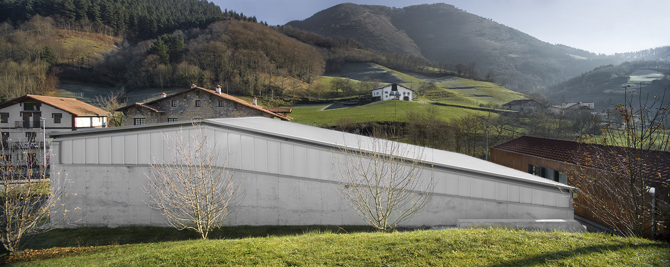 El proyecto busca una continuidad con la arquitectura y la configuración del paisaje del entorno, desde un lenguaje arquitectónico actual, tanto en lo que a la configuración formal del programa se refiere, como a la conformación material del mismo, como a su inserción en un paisaje tan determinado. Así el volumen del frontón se hunde, aprovechando las dos paredes ciegas, necesarias para el juego de la pelota como muros de contención, e incorporando el desnivel creado como graderío para los espectadores, resultando de este modo un volumen de menor impacto cuya cubierta dialoga con las cubiertas tradicionales de los caseríos del valle.