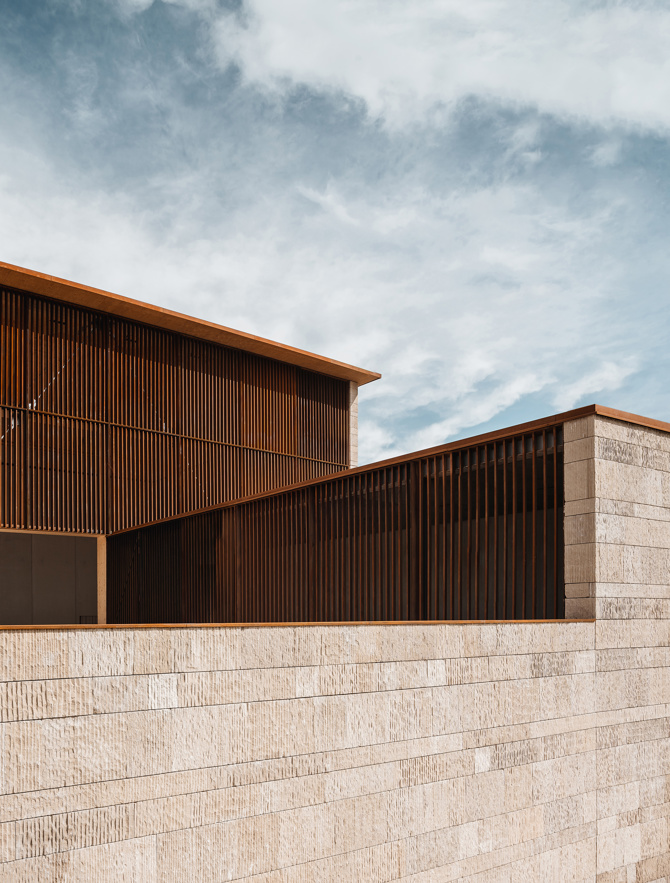 Muros de hormigón prefabricado. Revestimiento de sillar de piedra arenisca floresta. Estructura de madera laminada. Celosías de acero cortén