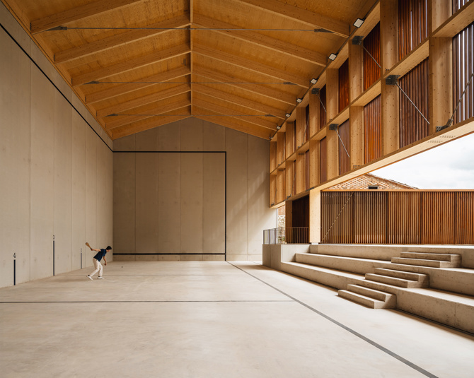 La estructura de la cubierta y de la fachada sur del frontón se proponen de otro modo: en este caso es la madera laminada el material empleado. En particular, la cara sur del frontón se construye con una potentísima cercha de madera que sólo apoya en sus extremos y en el punto donde el volumen perpendicular de “kiosko” y vestuarios alcanza el plano de fachada. De este modo, se potencia la continuidad y conexión entre el nivel del frontón y el ámbito de la plaza, puesto que no hay elementos portantes que dificulten el tránsito o las vistas. Además, el punto donde la cercha apoya -coincidente con el arranque del volumen perpendicular- se celebra generando un pequeño palco, pensado para que los habitantes de movilidad reducida puedan acceder a pie llano desde la plaza.