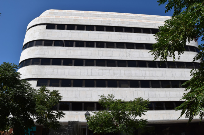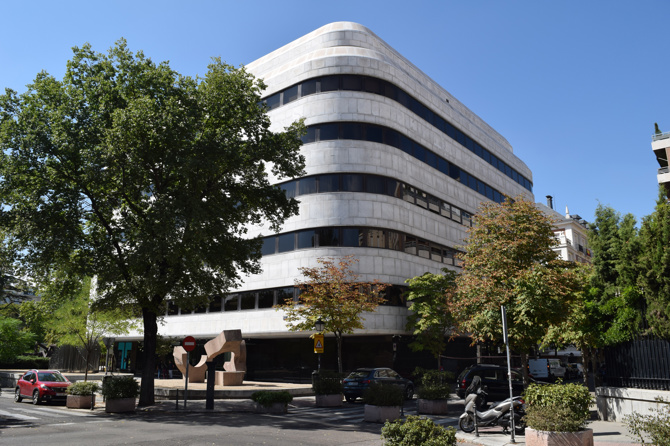Al exterior, las ideas básicas que prevalecieron en el diseño de José Luis Picardo fueron: la compacidad volumétrica, la dulcificación de líneas mediante el redondeo, el retranqueo de la planta baja para enfatizar el cuerpo superior que flota sobre el basamento, y la simplicidad de materiales y colores elegidos, bandas continuas de mármol blanco, alternadas con otras de cristal gris oscuro y carpinterías de aluminio anodizado en bronce, efecto este de gran rotundidad y contraste.