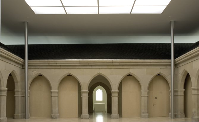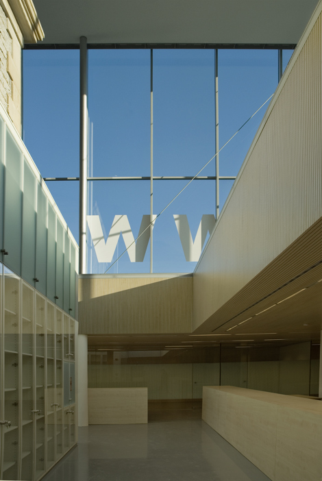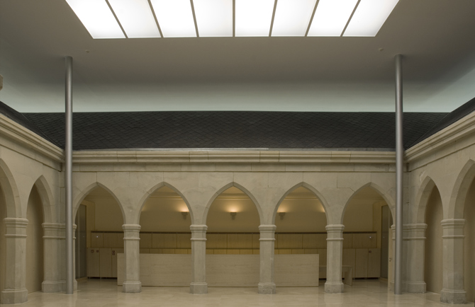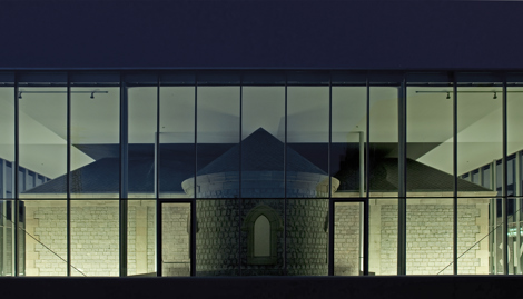 La idea principal es preservar el antiguo edificio dentro de una construcción acristalada que permita a su vez la aportación de luz natural al sótano. Para ello se vacía un anillo perimetral al cementerio y a partir de esta grieta se proyecta la fachada acristalada del nuevo edificio. El sótano se desarrolla a modo de anillo externo en torno al cementerio y se disponen los diferentes almacenes y salas de trabajo. La propuesta contempla la convivencia de ambos edificios. La iluminación nocturna permitirá la comprensión total de la propuesta, al manifestarse la antigua edificación envuelta en la piel acristalada.