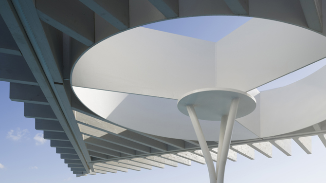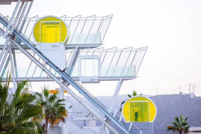 La estructura metálica triangulada se apoya en los diferentes bancales y sobre ella descansan las pasarelas de acceso a los seis niveles de conexión. En las pasarelas se han utilizado redes tensadas de malla metálica y alfombras azules tendidas en el suelo. Las cabinas se han construido con vidrio curvado y plano amarillo con dos grados distintos de transparencia. Todos los elementos han sido diseñados específicamente para mejorar la experiencia: desde la botonera hasta el estribo.