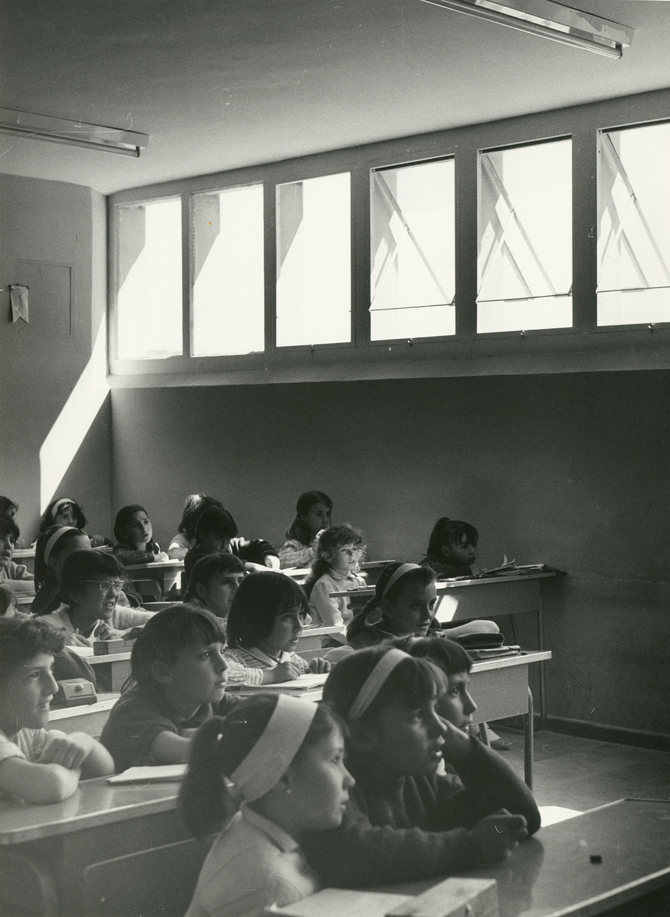 A la industria y la iglesia habría acaso que añadir los espacios docentes para completar un listado esencial de los equipamientos modernos en la España franquista. Nos quedamos con la entrañable fotografía de un aula del Centro Concertado Juan XXIII en Zaidín, Granada, proyectado por García de Paredes, no tanto por su interés como fotografía de arquitectura como por la fortaleza e intensidad de la mirada de los niños y niñas. Nuevamente, mirar a los que miran. Ensalzamos también el interés del contrapicado que fotografía Pando en la Facultad de Geológicas de Oviedo, donde los universitarios se interponen en una amalgama de planos y texturas de muros, huecos y cubiertas. La arquitectura se entiende desde el fragmento, la parte ha de ser capaz de explicar el todo. Y en esta fotografía formalista y abstracta la presencia de individuos completa el código interpretativo de la imagen.