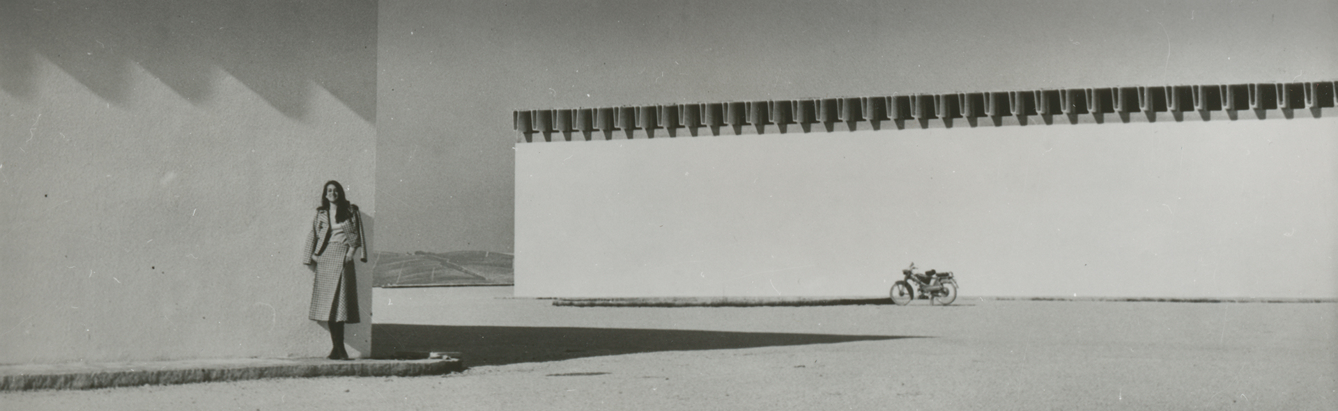 Hay una fotografía bella, verdadero icono visual de nuestra modernidad, donde el posado se convierte en el alma conceptual y compositiva de la fotografía. Las superficies blancas y abstractas de las bodegas Garvey, obra de Miguel Fisac, se sitúan en primer y segundo plano sobre un suelo continuo y aséptico. La expresividad de las cubiertas “ahuesadas” fortalecen la onírica composición que cuenta con una mujer y una motocicleta como habitantes metafísicos del lienzo pictórico.