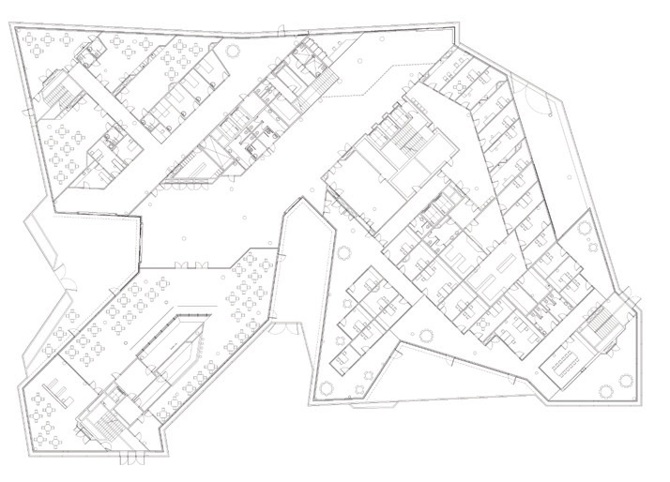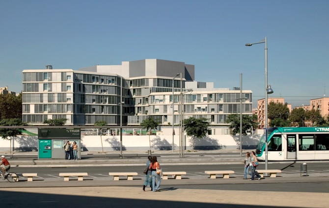 La solución fue un volumen fragmentado de planta quebrada que buscaba de vez en cuando aquellas aristas verticales que aseguraran, por un lado, la continuidad visual de las calles perimetrales y, por otro, conformaran una plaza interior que recogiera las callejuelas del nuevo barrio de viviendas de baja altura que debía construirse en el solar vecino. También en altura estaba atento a lo que sucedía alrededor y oscilaba desde los 100 m en la zona más próxima a la explanada del Fórum hasta los 15 m cuando se acercaba a las viviendas vecinas.