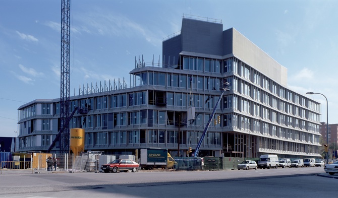 En el solar de 13.818 m2 estaba previsto construir un gran edificio de oficinas de 34.538 m2 y un geriátrico municipal de 12.000 m2. El lugar recibía las influencias de las trazas del Fórum, de la cuadrícula de Cerdà, de la Diagonal y de la antigua carretera de salida a Francia, y las edificaciones que lo rodeaban tenían alturas y caracteres muy diferentes. El proyecto quiso entrelazar y dar continuidad a todas estas diversidades.