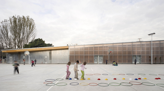 El programa del encargo queda definido por modelo de "gimnasio-sala polivalente" para escuelas primarias del Departamento de Enseñanza de la Generalitat de Cataluña. El edificio es lo más estrecho y largo posible, dentro de los márgenes que ofrece la normativa, por tal de hacer caber el conjunto gimnasio-pista dentro de la explanada que ocupa la pista polideportiva existente. Este emplazamiento ahorra cualquier adaptación topográfica para a la nova construcción.