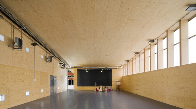 El nuevo volumen es contiguo, a la rampa de acceso principal a la escuela, evitando que el edificio proyecte su sombra a la pista polideportiva exterior. La cubierta se resuelve con una pendiente paralela a la rampa por tal de resolver la impermeabilidad del edificio por geometría, una solución más coherente a una construcción basada en sistemas ligeros. Las comunicaciones entre las diversas partes del programa se resuelven a través de un porche orientado a Sur.