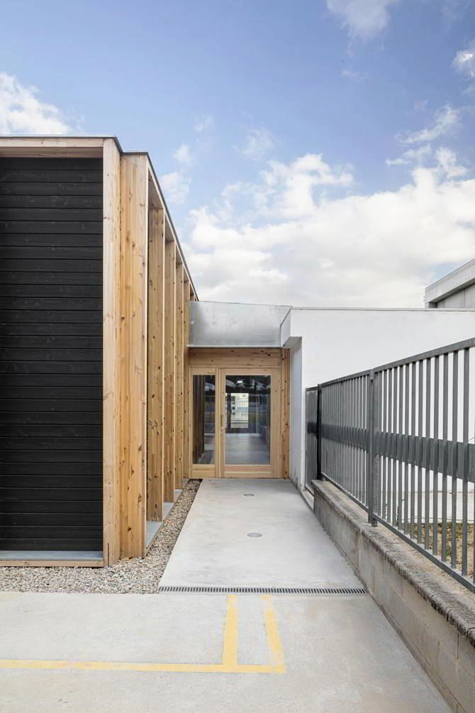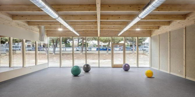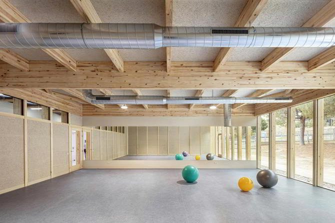 Perimetralmente a la pista, un bosque de pilares y jácenas de madera natural prefabricados, permite liberar el suelo de estructura, estableciendo relaciones con la verticalidad de la arboleda adyacente y los sistemas modulares preexistentes en el solar.
