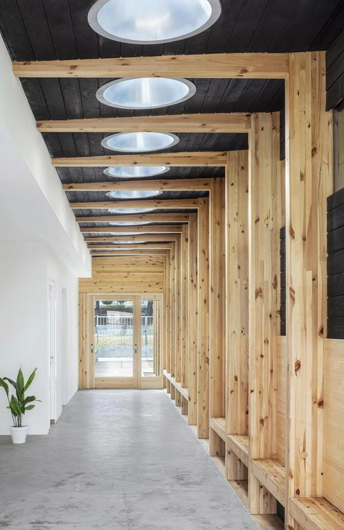 Surge así la idea de explorar la madera; como un material descarbonizado del emplazamiento, el módulo; como un sistema constructivamente eficaz de la parcela y la luz; como un recurso natural, capaz de crear un ambiente sostenible y saludable.