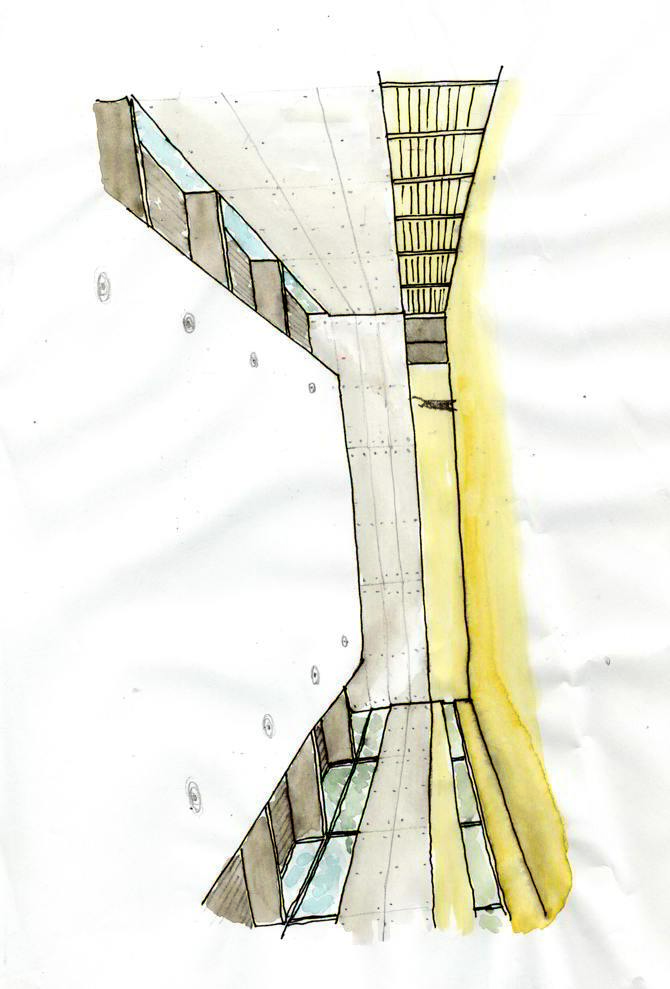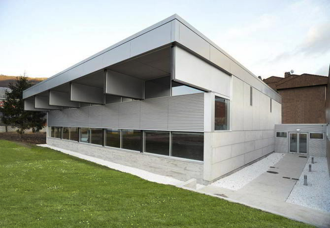 Las vistas al sur— la fachada del edificio que se ve al entrar a Mieres desde la autopista— son bonitas hacia la montaña, pero esta orientación puede ser muy molesta a la hora de entrenar. Por ello esta fachada se convierte en un vuelo que nos quita el rigor del verano y una serie de orejas, de vigas forradas, que impiden las entradas de rayos matutinos y del atardecer de menor inclinación. Esta fachada se parte y disminuye su escala para ser un volumen en tamaño similar a los ya construidos.