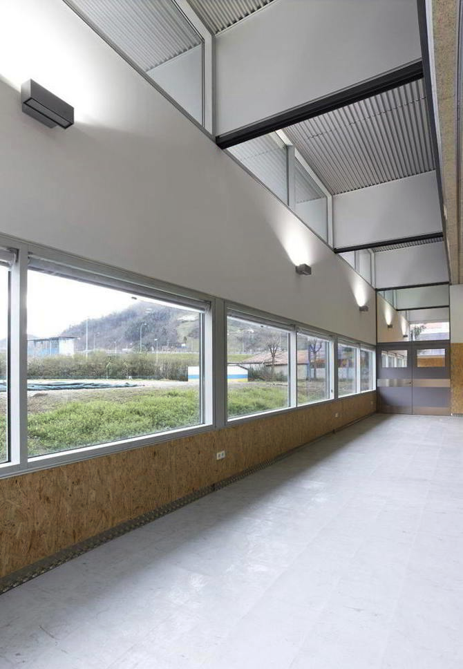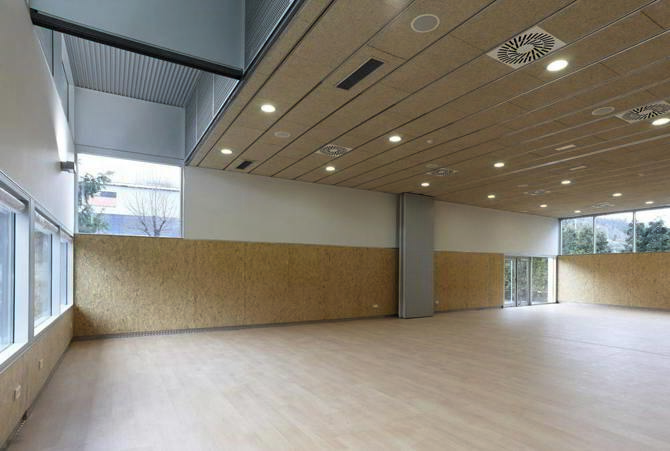 En el interior, la madera favorece el cálido uso deportivo y el uso de paneles de viruta en el techo nos permite una absorción acústica que favorece el confort en el uso previsto. Una puerta abatible en tramos permite la división para dar flexibilidad en distintos usos.